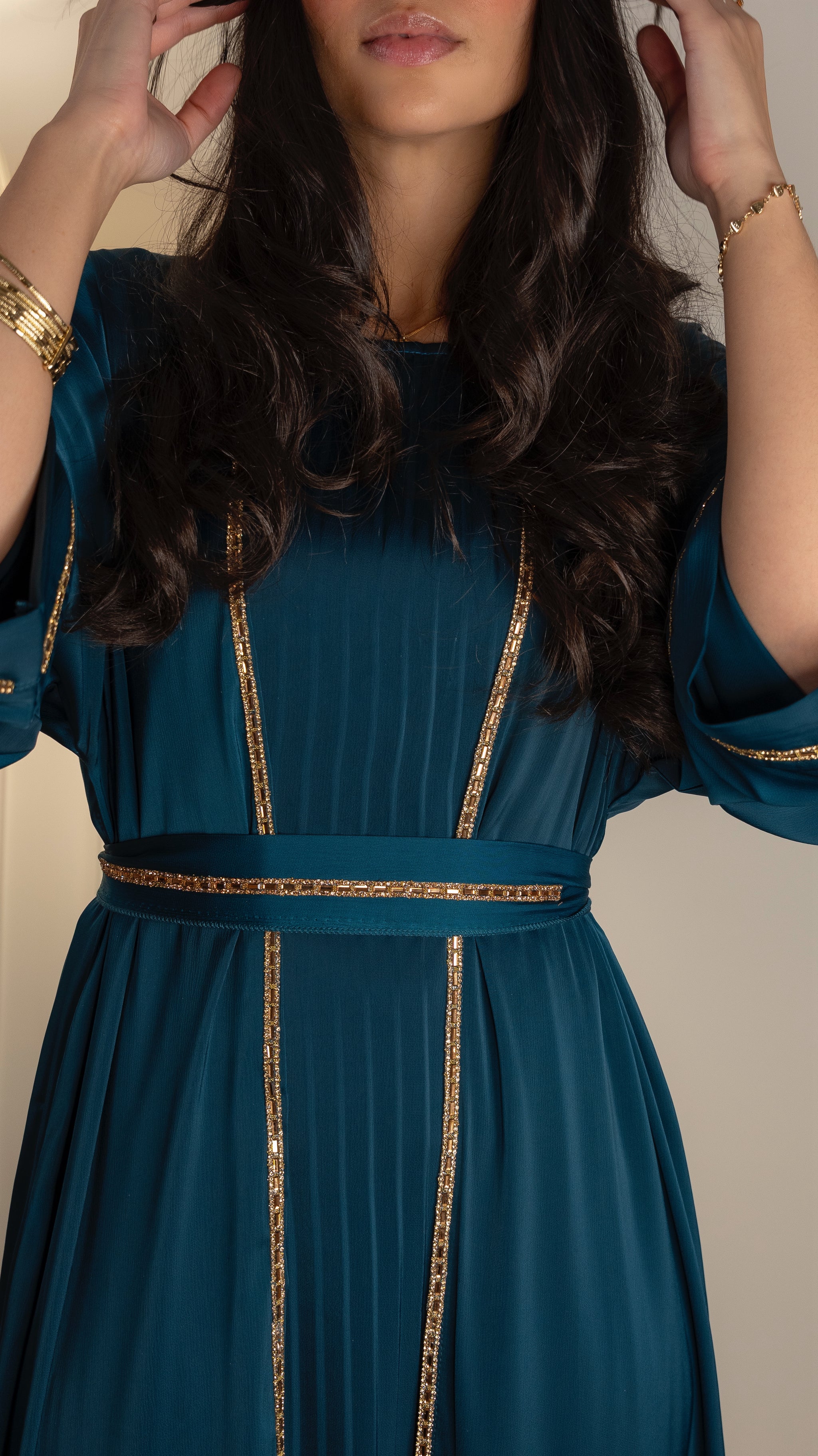 Cette création se compose de deux pièces : une abaya aux lignes épurées, accompagnée d’une robe intérieure assortie, délicatement plissée.